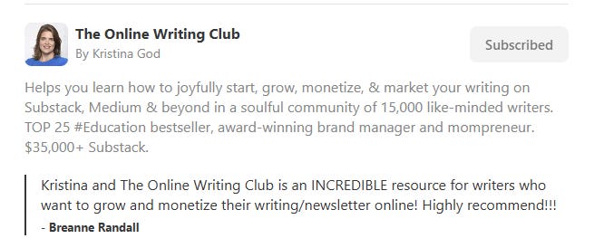 The Online Writing Club is a newsletter which helps writers start, grow, monetize and market their writing and newsletter online.