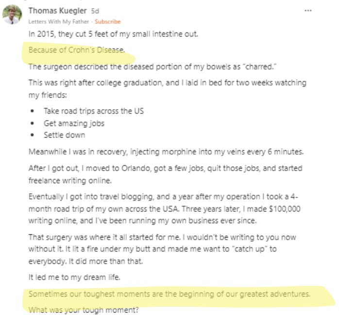 But Notes, Substack’s internal social media network, is different, feels like home and family, and so Tom dares to share how Cohn’s Disease motivated him to prove something and eventually led to his freelance writing career: