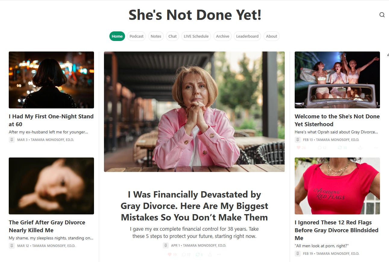 Gray divorce is rising after 50. Learn how to heal, rebuild your life, and find support through shared stories with Tamara Monosoff, Ed.D.’s new community called She’s Not Done Yet1.