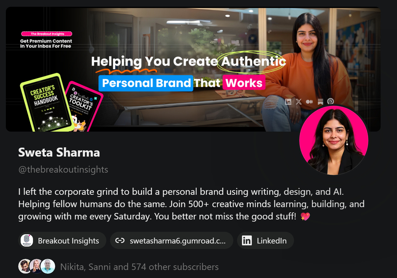 My POV: She replied to Gunnar’s post on Notes he shared with me via DM. So I thought I’d introduce you to her, too. Sweta has clearly designed this space on Substack with intention. Sweta’s profile is doing the exact job your profile should do: