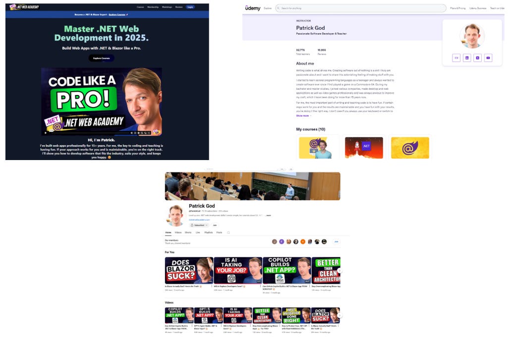 He’s a part-time YouTuber with 80,000 subscribers, a Udemy instructor with over 90,000 students, and the founder of the .NET Web Academy.