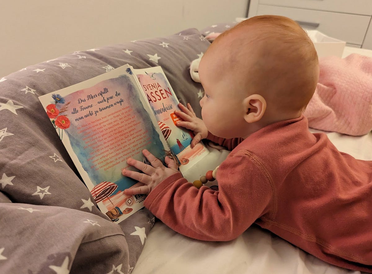 In the picture above, you can see my four-month-old little girl reading one of my romance novels.