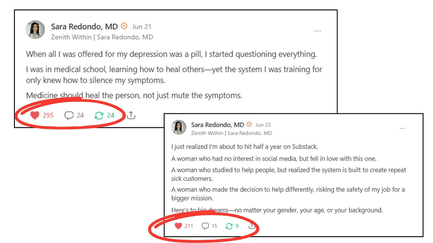 But she joined the Bootcamp. She started writing long-form stories about health and healing. Then she paired them with short, snappy notes.