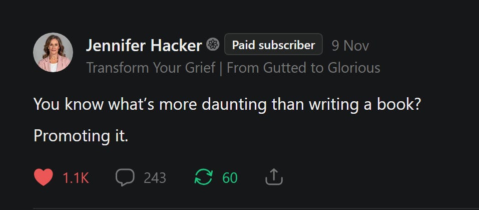 “Jennifer Hacker ran a sensational campaign and got her book to Number One Bestseller on Amazon across SIX categories,” shared my collab partner Fleur Hull from The Substack Bookstore who’s doing book publishing, promo and PR for the small guys, the indie authors and purposeful dreamers. See it for yourself!