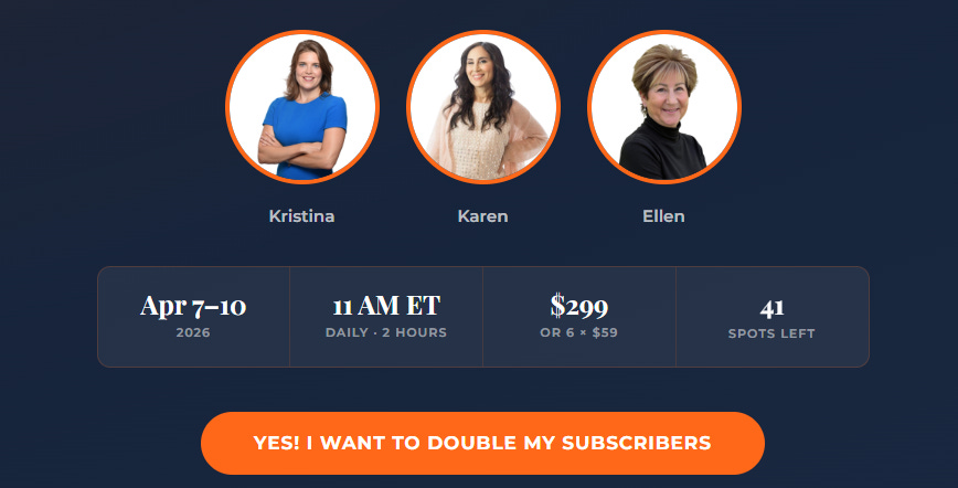 For all smallstackers and midstackers with less than 1, 10, 100, 1000 or 10000 subscribers, here’s my 4 Day Substack Kickstarter Bootcamp for you with Ellen Scherr and Karen Salmansohn for you.