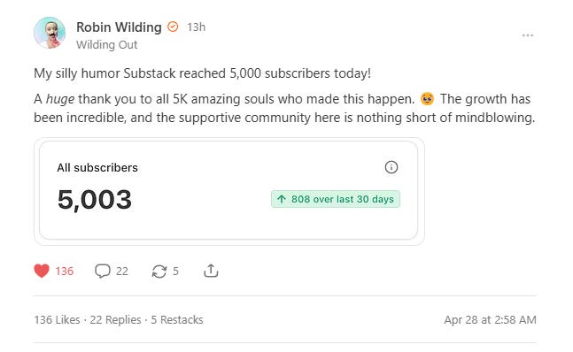 Who’s “silly” humor Substack reached 5,000 subs today!