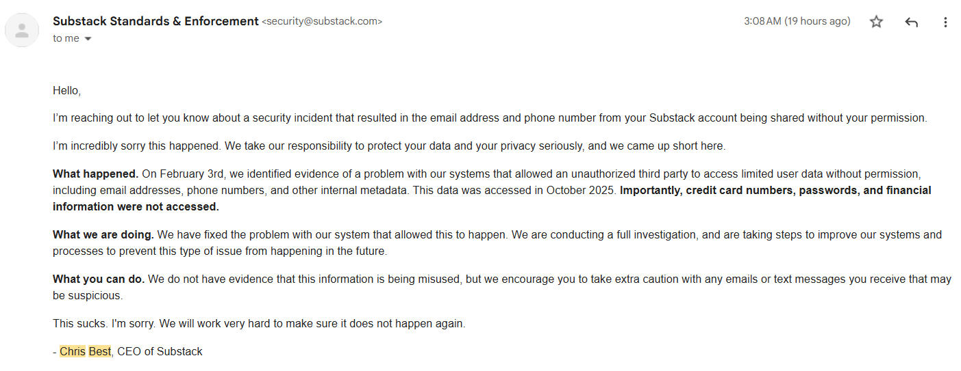 If your phone rings and someone claims to be support or acting in the name of Substack or so… be cautious.