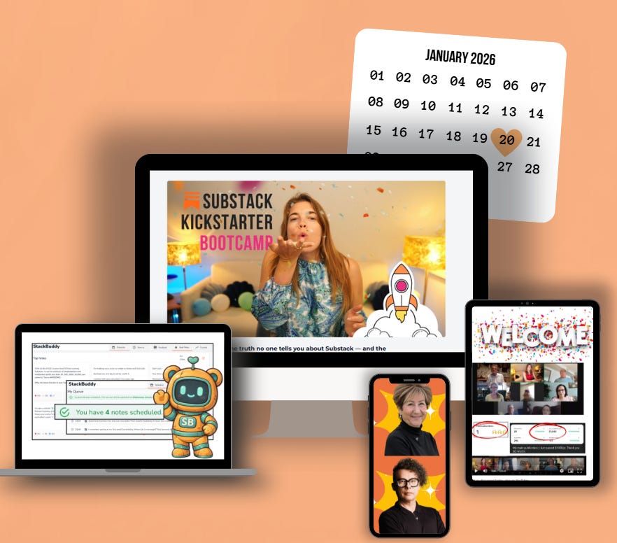 ⭐I am co-hosting this year’s LIVE Substack Kickstarter Bootcamp with psychotherapist and Bootcamp grad Ellen Scherr. She has been there. She finished. Now for the very first time she’s teaching alongside me. You’ll learn how to read the mind of your audience, write magnetic long and short form posts and click-worthy headlines.