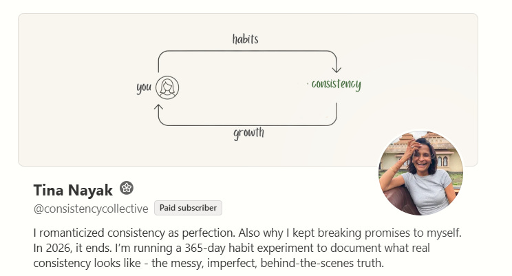 I’m Tina. I write The Consistency Collective — about building habits with self-kindness instead of streaks. For women who want to grow joyfully, not grind through guilt. Helping women keep promises to themselves — one habit at a time, joyfully. No perfect streaks required.