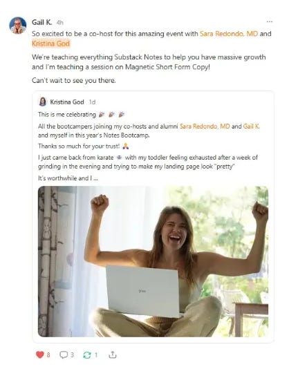 Bootcampers of mine are waking up to hundreds (sometimes 400–500!) new subscribers a month via Notes.